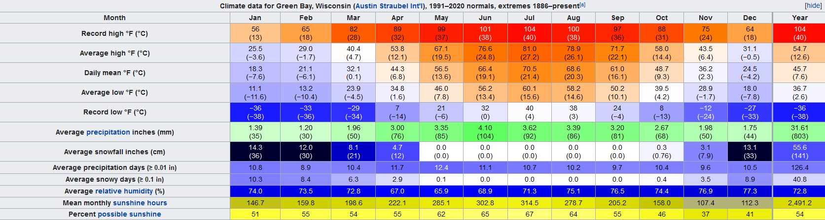 Date: 2021-11-12 03:33 pm (UTC)Вот Грин-Бей, например — март и ноябрь месяцы с Тср >0, по нашим меркам это уже не зима. В Милуоки, подозреваю, ещё теплее.
