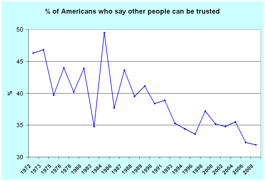 Mar. 11th, 2011 06:57 amЕсли вам казалось, что раньше между людьми было больше доверия, то под этими ощущениями есть и конкретные цифры.Уровень доверия между людьми и в России и в США и во многих других странах имеет тенденцию к снижению. Вот как выглядит график процента американцев, считающих, что людям можно доверять.