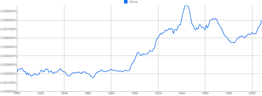 Ну и Китай: мощный рост в 20 веке и пик вторую мировую и ко времени установления КНР, потом падение и снова рост к началу Культурной революции, потом опять падение. С начала 1980-х снова начинается рост, как и подъем влияния самого Китая, причем в 2000-е начинается ускорение. Но конец 2000-х мы еще тут не видим, но, видимо, быстрый рост упоминаеомости Китая продолжается.