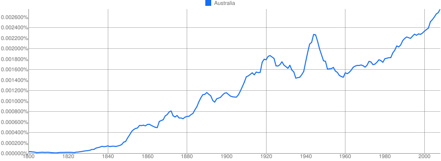 Из интересного: любопытный и неуклонный рост относительной успоминаемости Австралии (и Новой Зеландии):