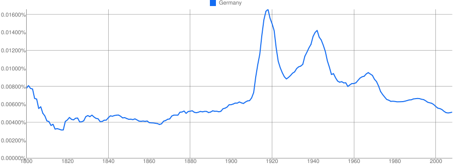Россия/CCCР. Тут тоже всего логично: скачки во время Революции, потом во время Второй мировой. Все это время идет рост упоминаемости Советского Союза, а не именно России, то есть Советский Союз потихоньку стал замещать привычную Россию. Потом рост во время перестройки и начала 1990-х и потом падение.