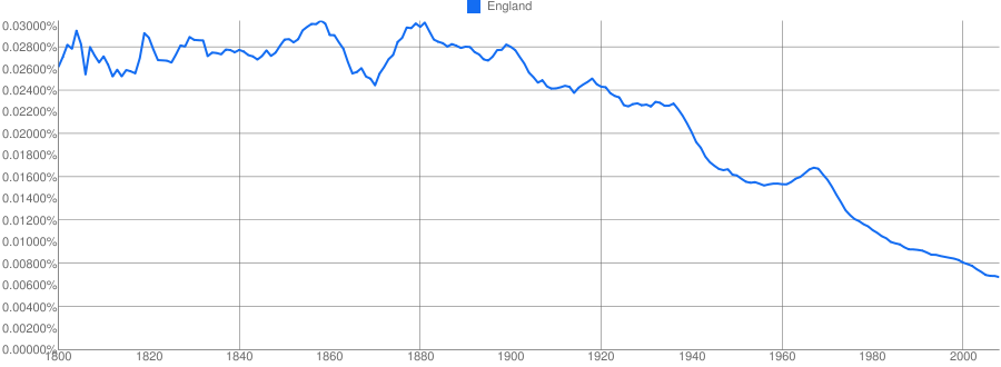 Неумолимо уменьшается упоминаемость Англии в 20 веке: