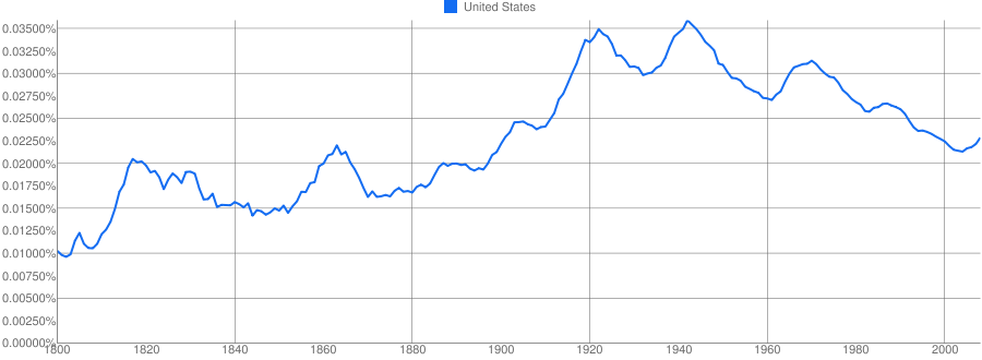 Еще крайне примечательна упоминаемость самих же Соединенных штатов: она неплохо совпадает с относительным ростом и относительным падением влияния США в мире: