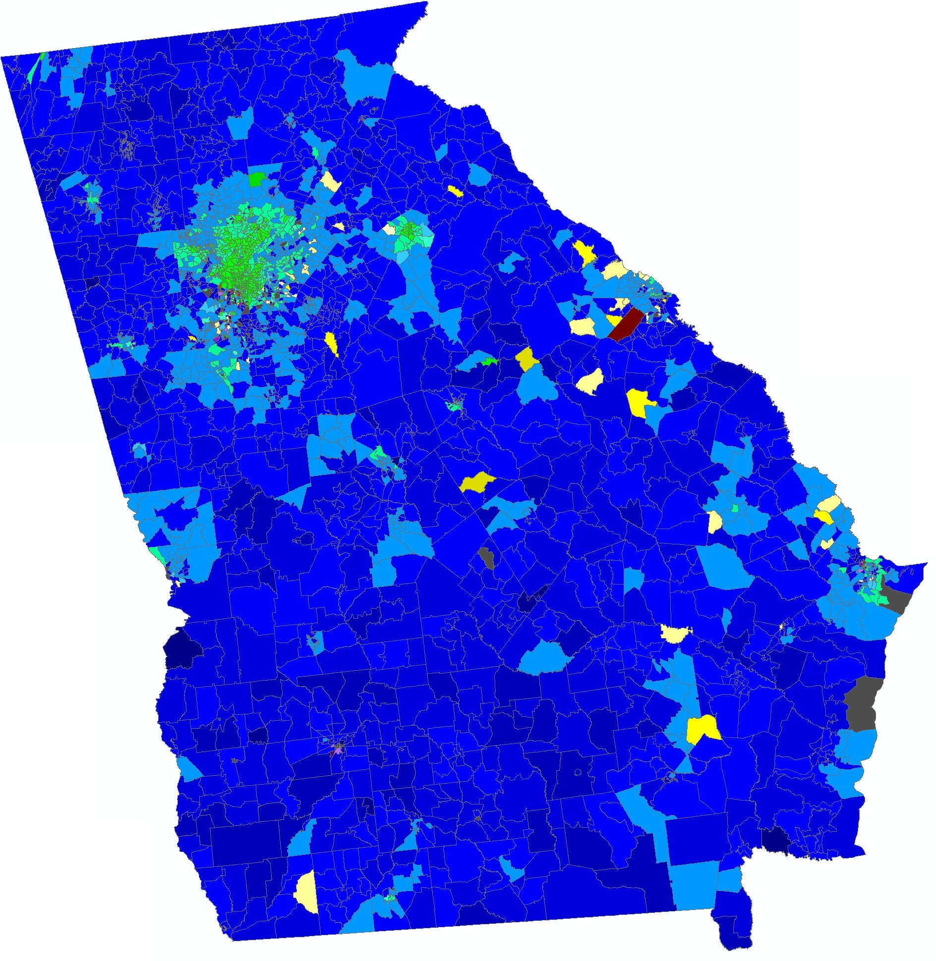 Нашел пару любопытных карт результатов Супервторника по участкам. Вот Джорджия - республиканцы. Синий цвет - Трамп, зеленый - Рубио, желтый - Круз. Красный/розовый цвет - Карсон что ли? Великолепна видна агломерация Атланты, уже меньше город Атенс, где находится университет Джорджии. Чуть меньше видна Саванна и еще меньше Колумбус и Мейкон.