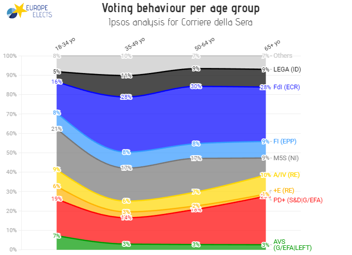 По возрасту. Интересно, что у Демократической партии меньше среди среднего возраста. У Братьев Италии меньше среди молодежи, а у Движения пяти звезд наоборот больше.