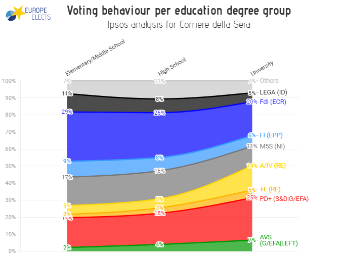 По уровню образования. Более образованный - левый электорат: как у Демократической партии, так и у Зеленых. И либеральный - "Действие". Менее обарвазонный - у всех правых и популистских партий.